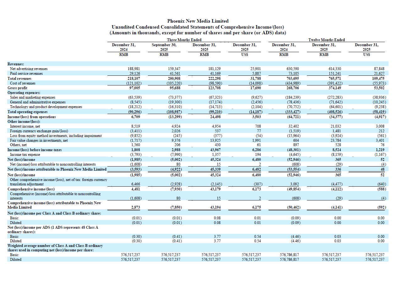 Net income attributable to Phoenix New Media Limited in the fourth quarter of 2025 was RMB45.3 million (US$6.5 million), compared to net loss attributable to Phoenix New Media Limited of RMB3.6 million in the same period of 2024. Net margin in the fourth quarter of 2025 was positive 20.4%, compared to negative 1.6% in the same period of 2024. Net income per basic and diluted ordinary share in the fourth quarter of 2025 was RMB0.08 (US$0.01), compared to net loss per basic and diluted ordinary share of RMB0.01 in the same period of 2024.